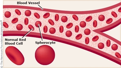 In hereditary spherocytosis, red blood cells have an abnormal shape and are more fragile than normal red blood cells. These abnormal cells are broken down when they pass through the spleen, an organ near the ribcage that cleans dead cells and germs from the blood.