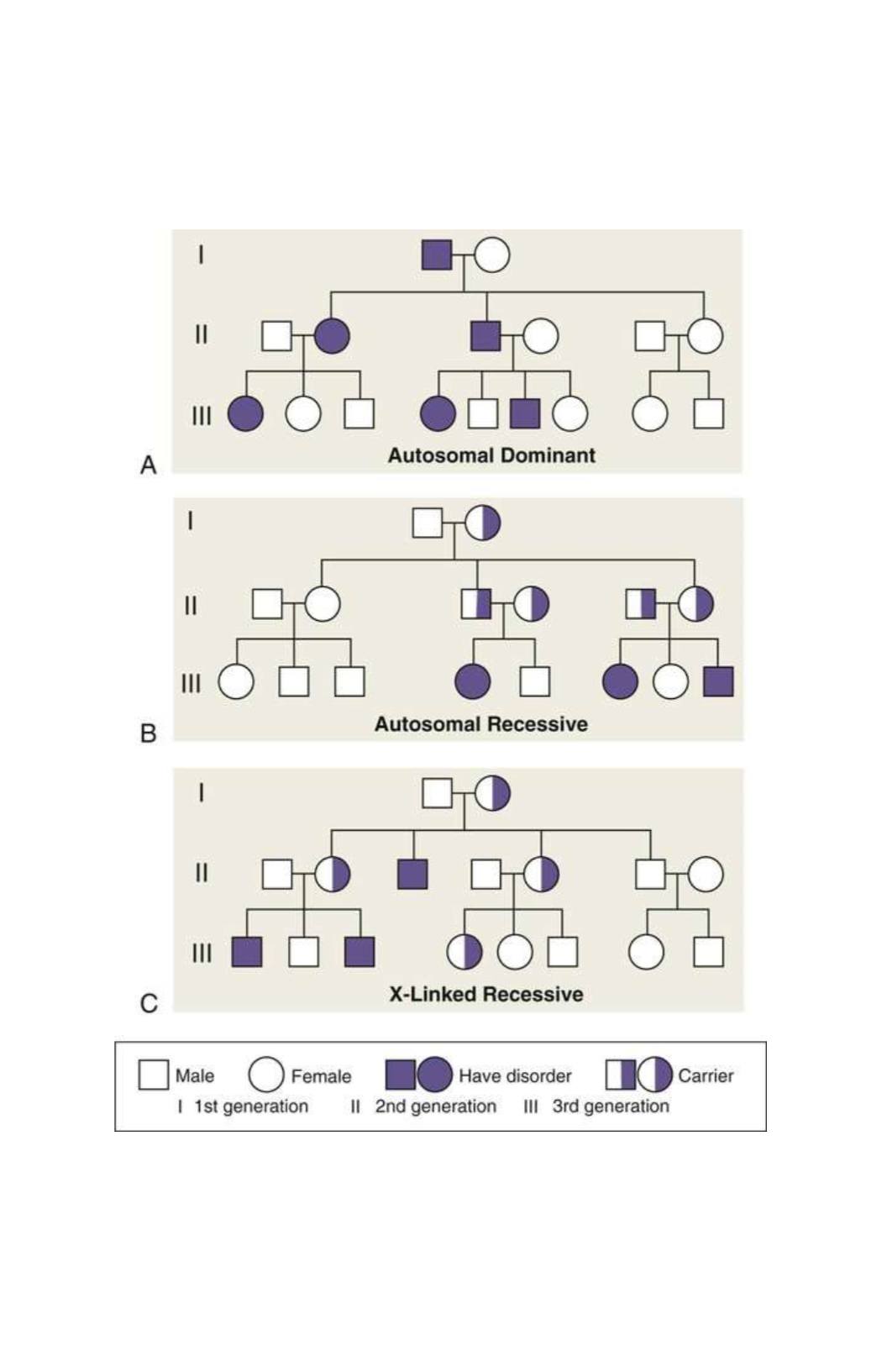 How can you tell from a family pedigree that a disease is autosomal dominant? Autosomal recessive?