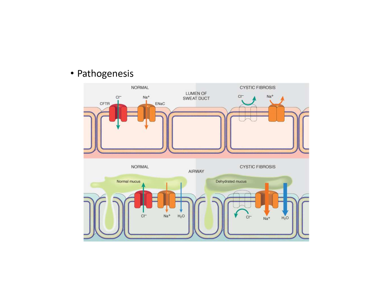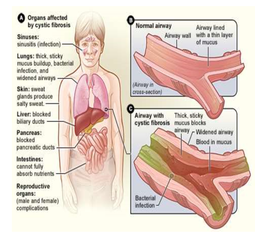 Defect in CFTR gene -> affects cAMP pathway -> Cl- channel disorder -> affects mostly lungs, also pancrease, liver, kidneys, intestine