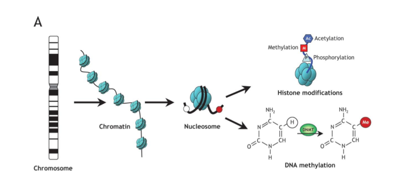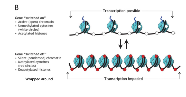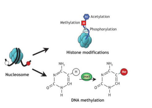 Condensation of chromatin and replication of DNA - regulated by chemical modifications of histones - these are influenced by DNA methylation, which occurs in regions of DNA rich in cytosine and guanine and located in promoter regions upstream of genes