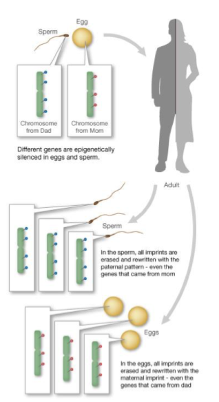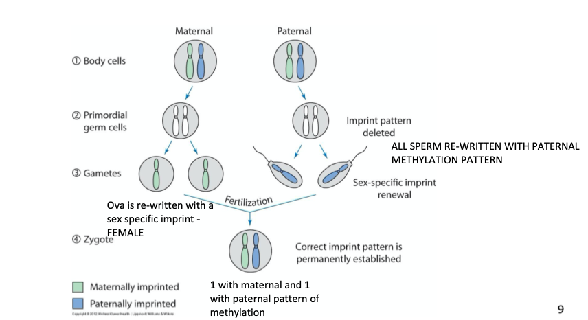 in the sperm all imprints are erased and rewritten with the paternal pattern, even the alleles that came from mum