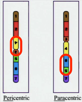 Inversion. There are pericentric inversions and paracentric inversions.