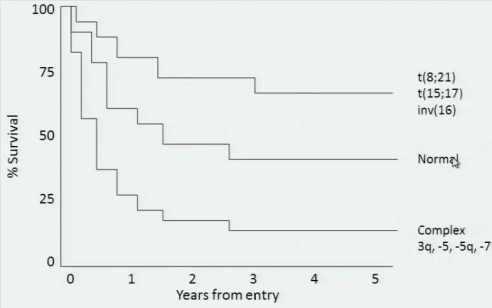 FLT3 duplications cause constitutive activation of a tyrosine kinase receptor and poor prognosis. NPM1 duplication in exon 12 = good prognosis. Note that some of the cytogenic abnormalities have a better prognosis and some have a worse prognosis.