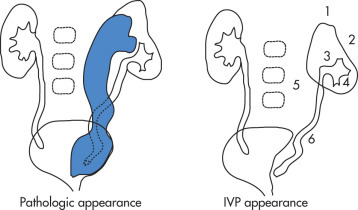 The drooping lily sign refers to the inferolateral displacement of the opacified lower pole moiety due to an obstructed (and unopacified) upper pole moiety in duplicated collecting system.