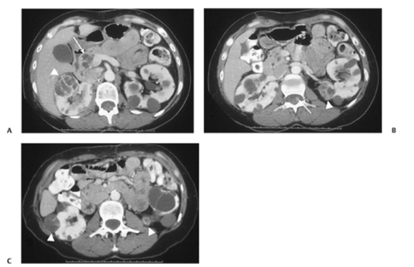 Fig. 63.1 (A) Postcontrast CT image shows bilateral renal cysts. There is a large cyst within the right kidney with thick enhancing septations (arrowhead). Note the multiple pancreatic cysts (arrow). (B) Axial image shows a mixed solid and cystic lesion in the left kidney (arrowhead), along with an enhancing nodule in the chord (arrow). (C)An additional complex cyst with enhancing septation is seen in the right kidney (arrowhead), along with a small enhancing lesion in the left kidney (arrowhead).