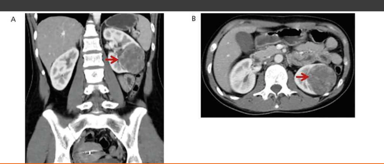 Reninoma is a tumour of the cells of the juxtaglomerular apparatus that produces excessive amounts of renin, resulting in a secondary form of hyperaldosteronism, manifesting clinically with hypertension (HT) and hypokalaemia1. This renal tumour is predominant in females, with a peak incidence between the second and third decade of life and, although uncommon, it is a treatable cause of HT2. It should be suspected in any patient with refractory HT associated with hypokalaemia and high levels of aldosterone.