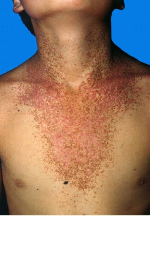 Kommer sent i barndommen med fedtede grumsede skællende papler lokaliseret til øverste del af kroppne, hals og ansigt