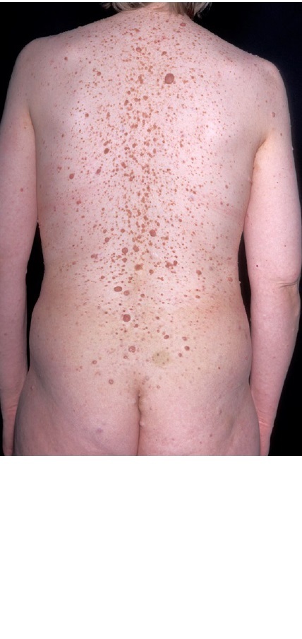 Patienter udvikler mange cafe au lait pletter, neurofibromatose, fregner i aksillerne og bløde, nodulære, hudfarvede hudtumorer