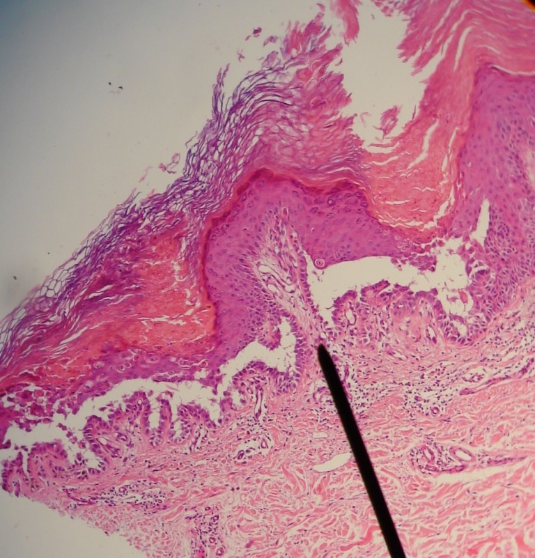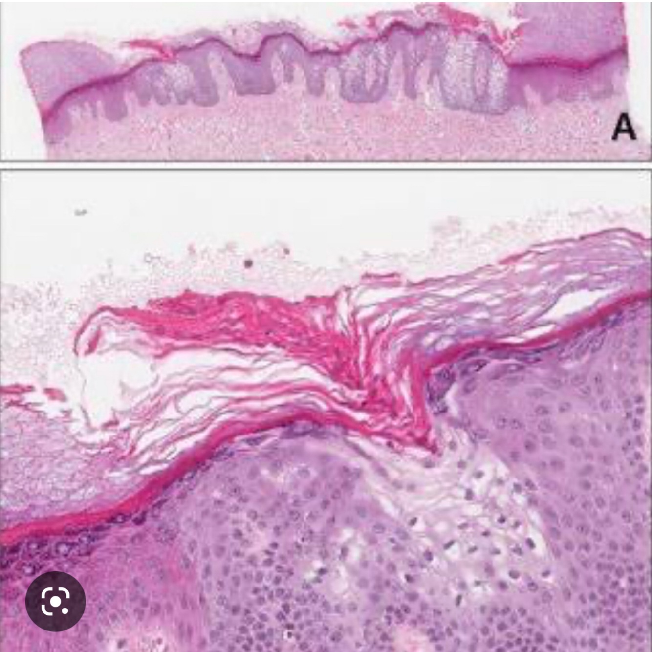 Colunas de paraqueratose, sob as quais há fendas, células disqueratóticas, arredondadas, com um halo claro, chamados de “corps rounds”