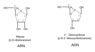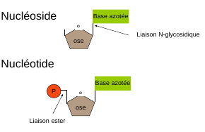 la base purique/pyrimidique et l’ose (ribose ou 2-désoxyribose) sont liées par une liaison N-glycosidique sur C1’