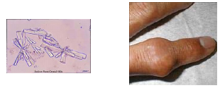 précipitation au niveau des articulations (urate monosodique) = inflammation