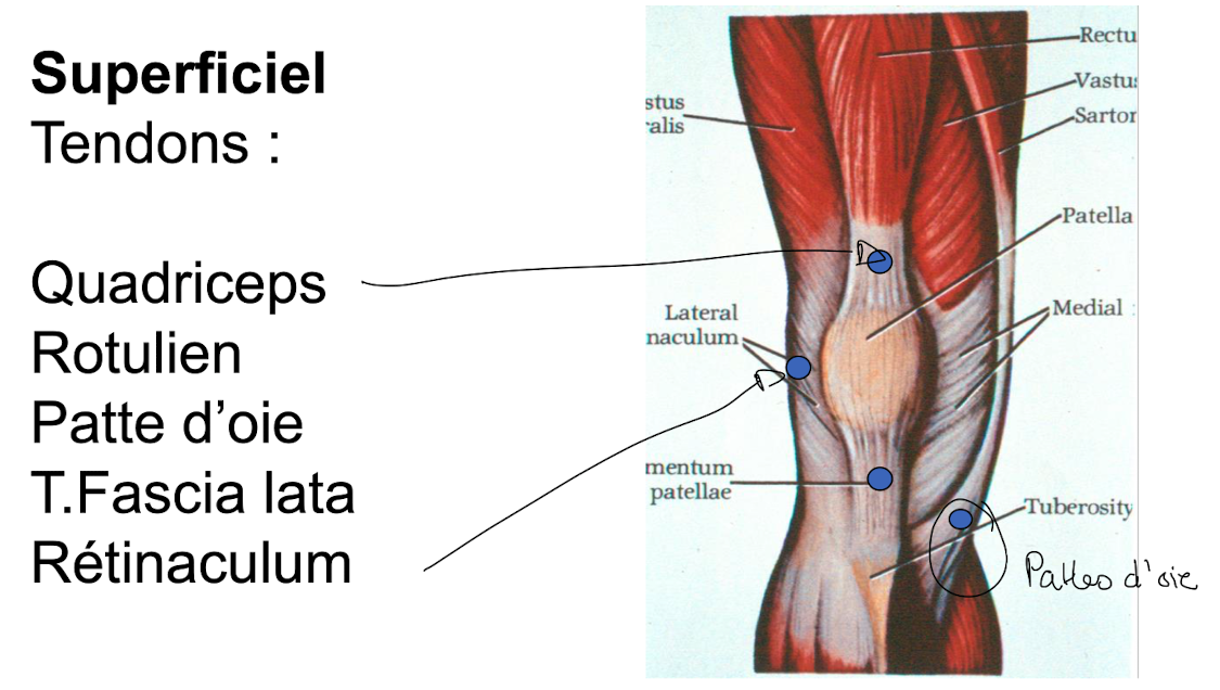 Quels sont les tendons dans la région patellaire antérieure superficielle?