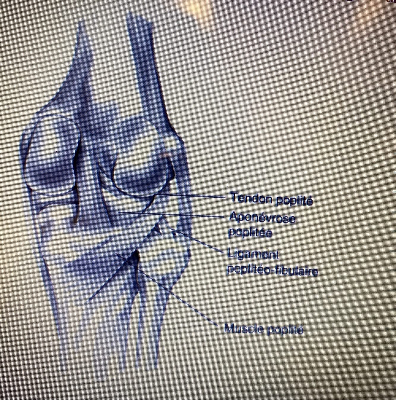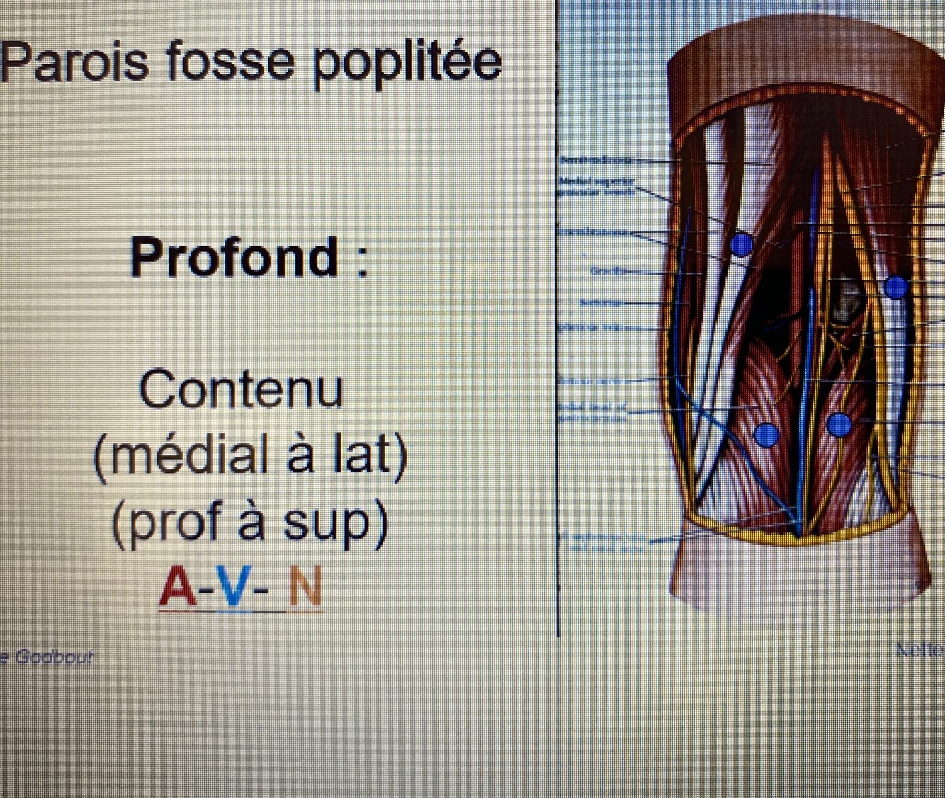 Artère poplitée en médial, veine poplitée en latéral et nerf sciatique en postérieur