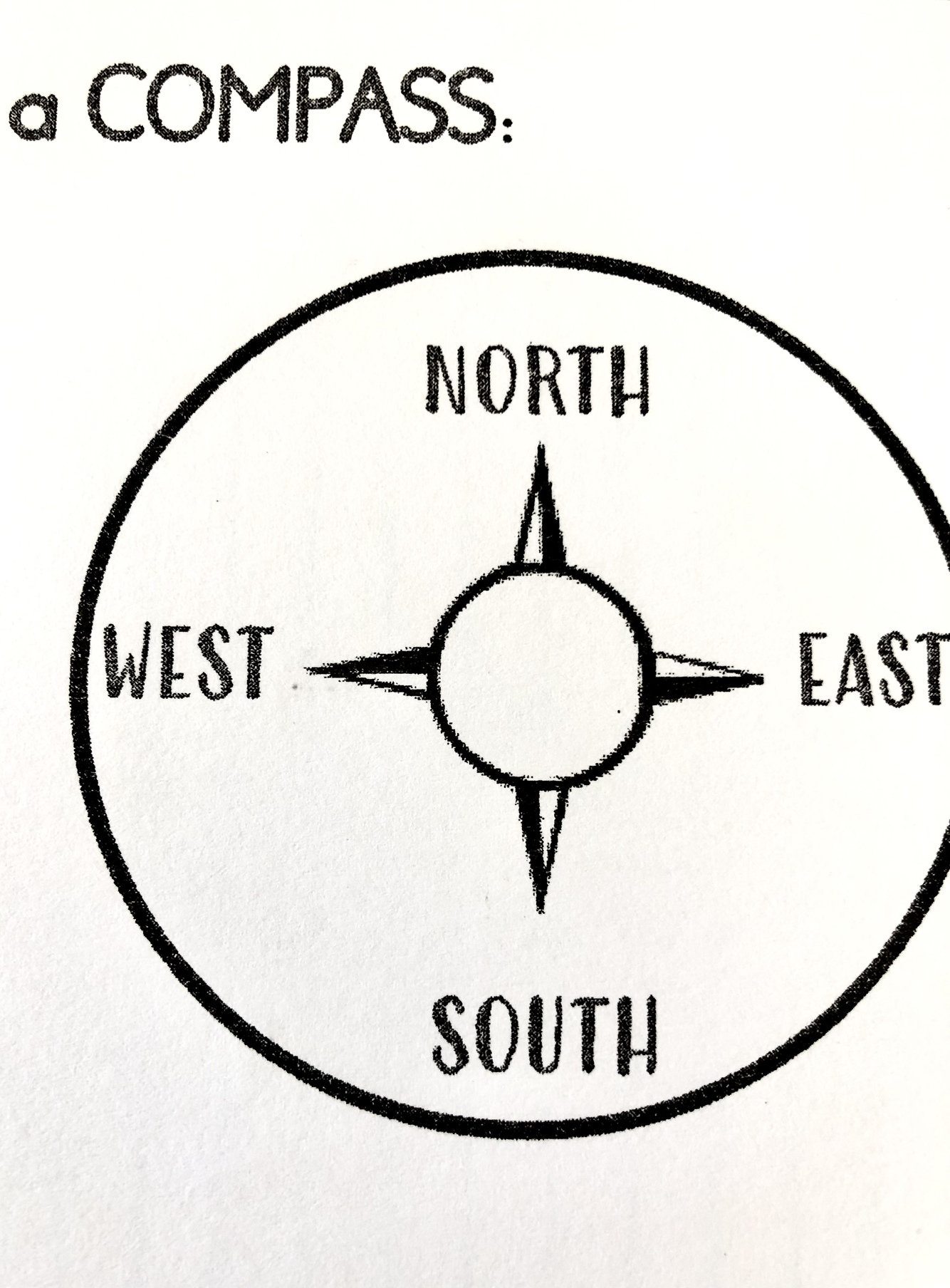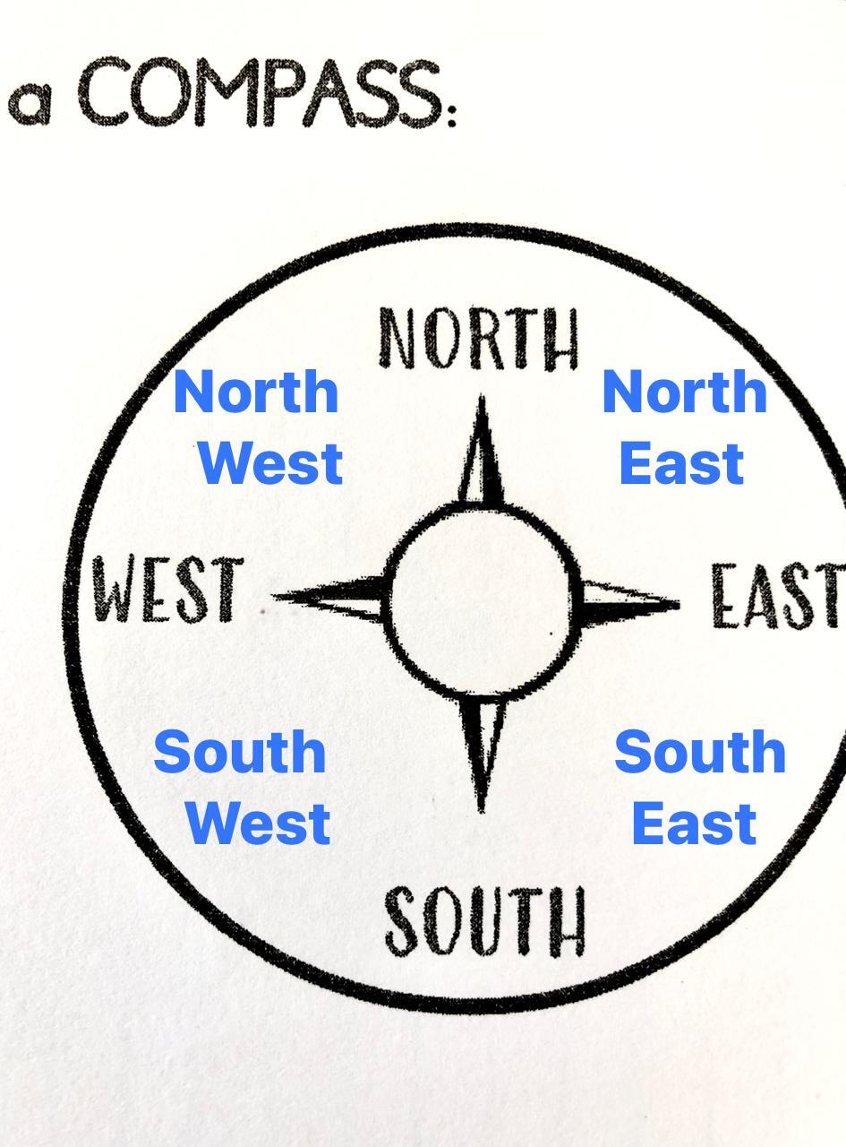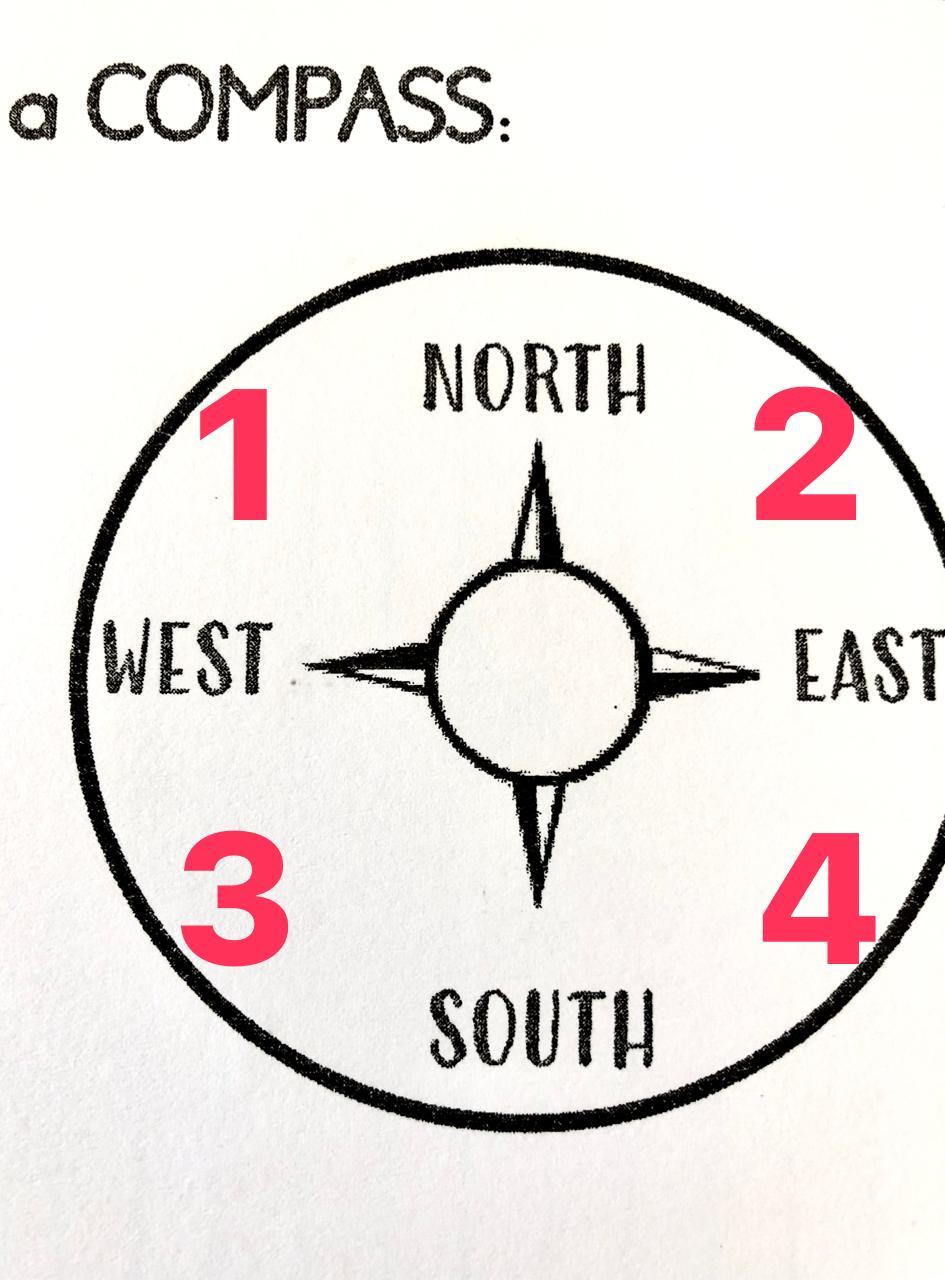 Fill in the missing directions on the compass (labelled 1 to 4)