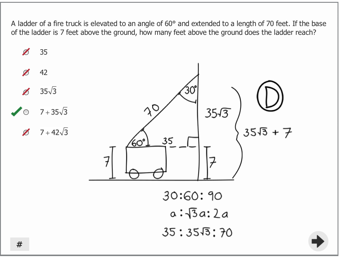 A ladder of a fire truck is elevated to an angle of 600 and extended to a length of 70 ft. If the base of the ladder is 7 feet above the ground, how many feet above the ground does the ladder reach?