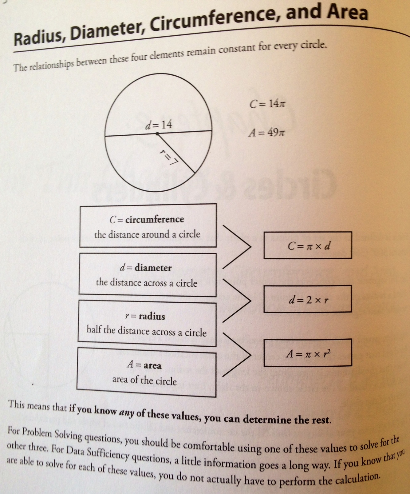 What are the relationships between the Radius, Diameter, Circumference, and Area of a circle?