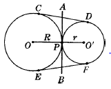 Circles O and O’ are tangent externally at P. AB is the common internal tangent of both circles. The line of centers OO’ passes through P, is perpendicular to AB, and is equal in length to the sum of the radii, R+r. Also AB bisects each of the common external tangents, CD and EF.