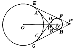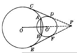 Circles O and O’ overlap. Their common chord is AB. IF the circles are unequal, their equal common external tangents CD and EF meet at P. The line of centers OO’ is the perpendicular bisector of AB and if extended, passes through P