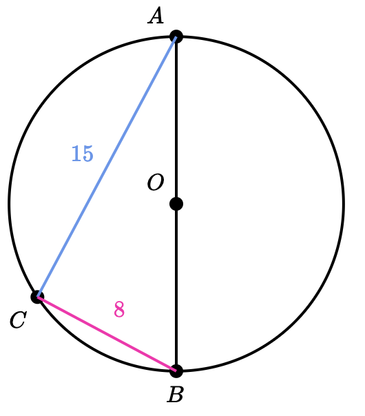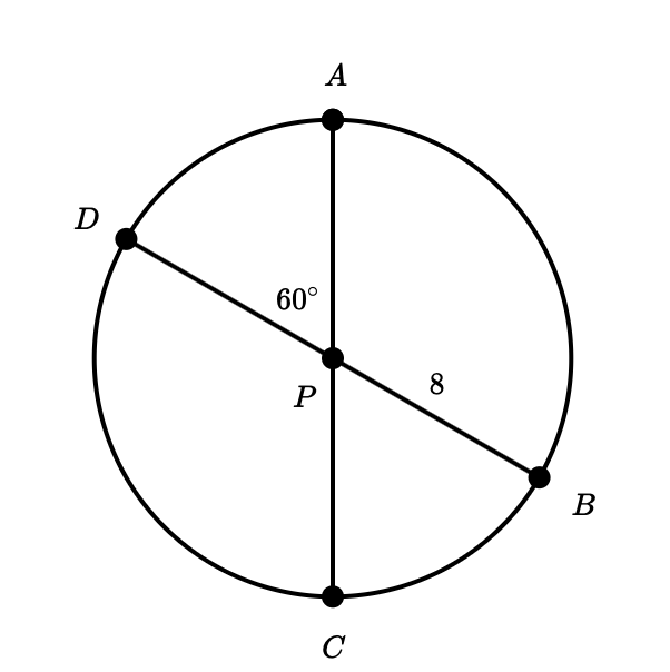 In the figure below, line (DB) and (AC) are diameters of circle P. The length of line (PB) is 8 units.