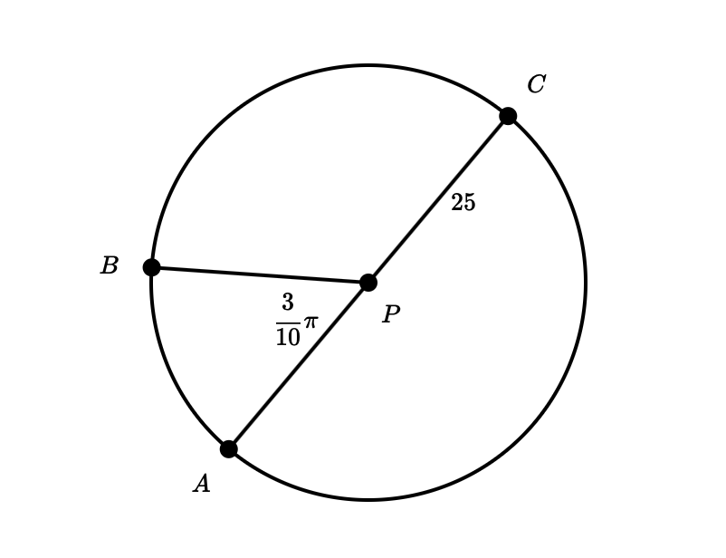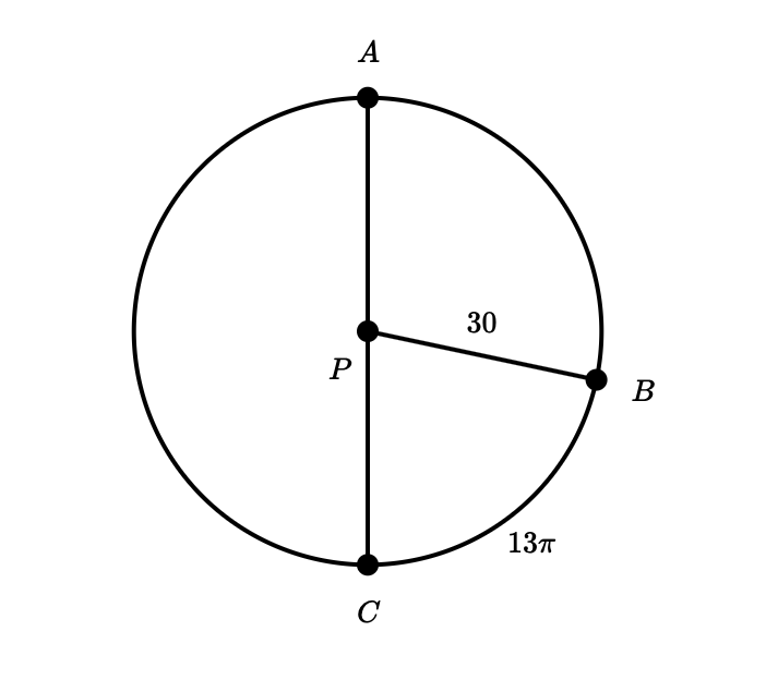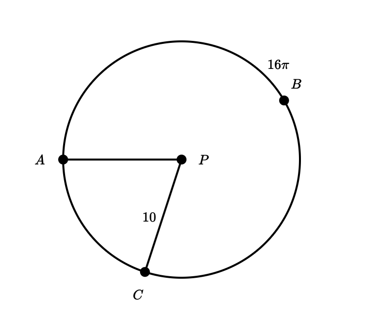 In the figure below, the radius of circle p is 10 units. Arc (ABC) has a length of 16π.