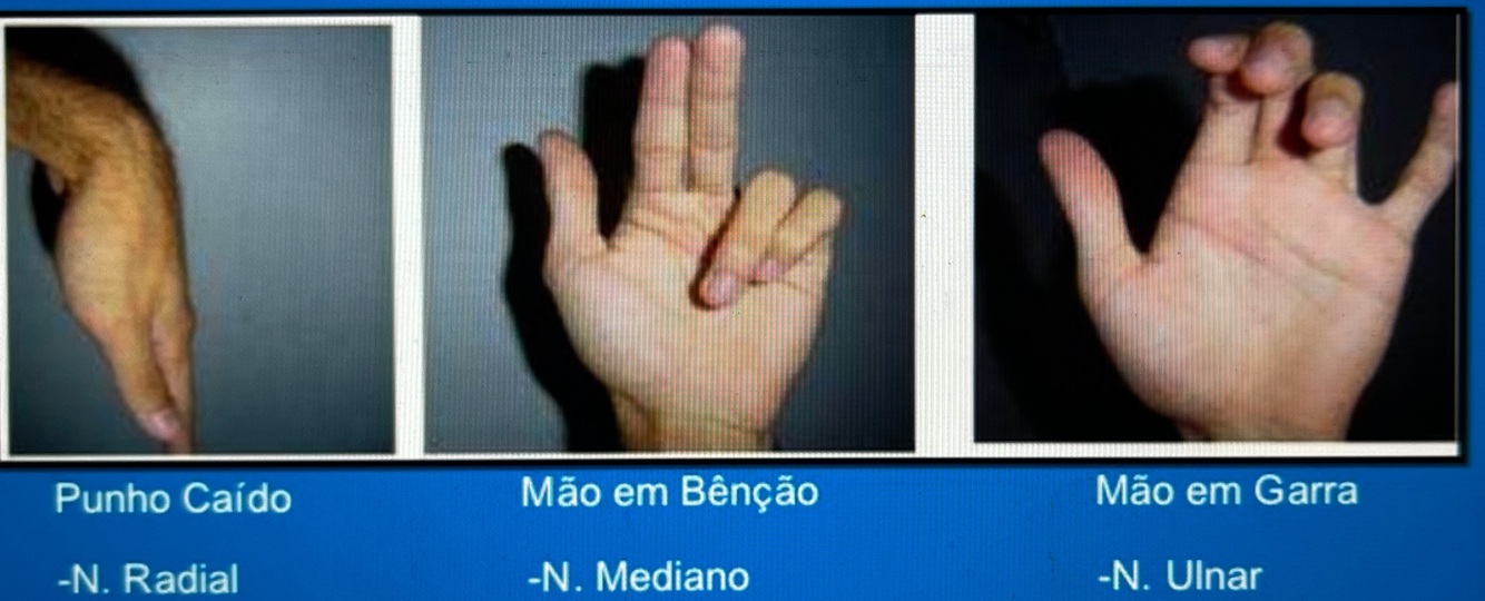 Mediano = benção Radial = mão caída (saturday night palsy) Ulnar = mão em garra Fibular = Pé caído