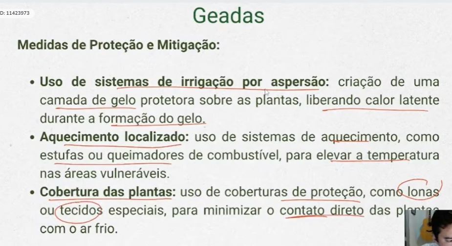 ” O uso de irrigação por aspersão pode ser considerado uma medida de proteção ou mitigação dos efeitos da geada nas plantas, bem como a cobertura com lonas. “