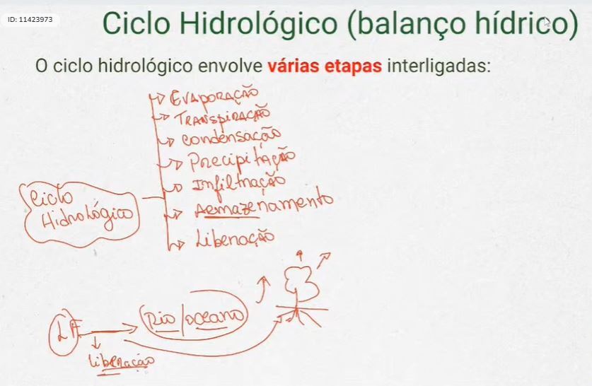 “Evaporação, infiltração, liberação e armazenamento são etapas do ciclo hidrológico.”