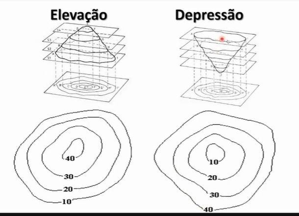 Qual a diferença entre elevação e depressão das curvas de nível?