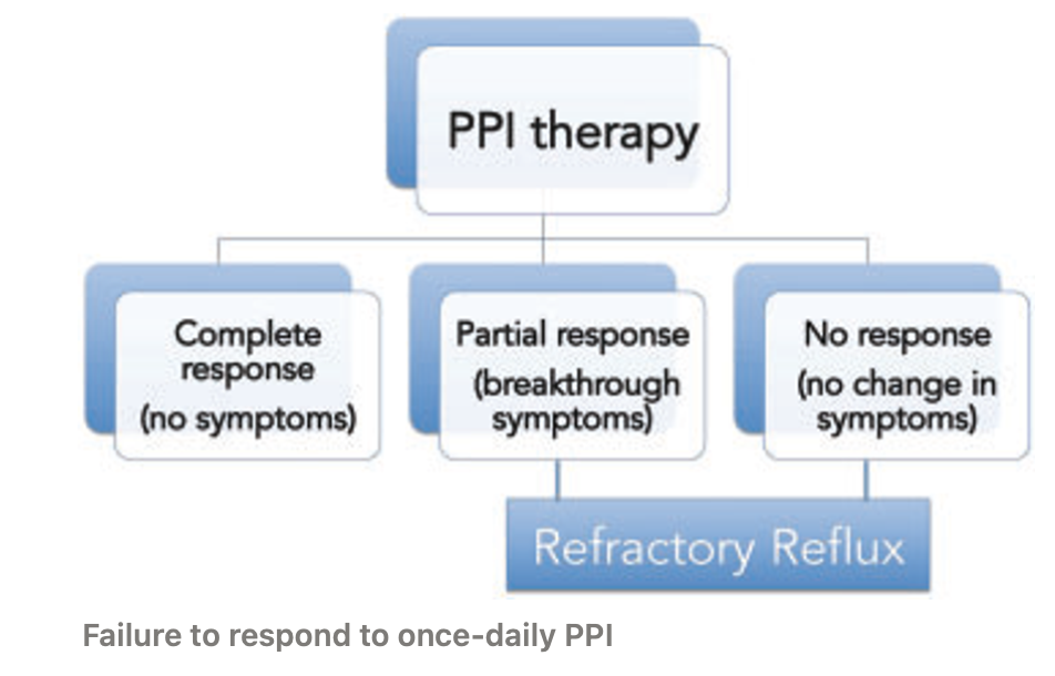 Refractory GERD definition: < 50% response in reflux related symptoms to an 8 - 12 weeks course of once a day PPI.