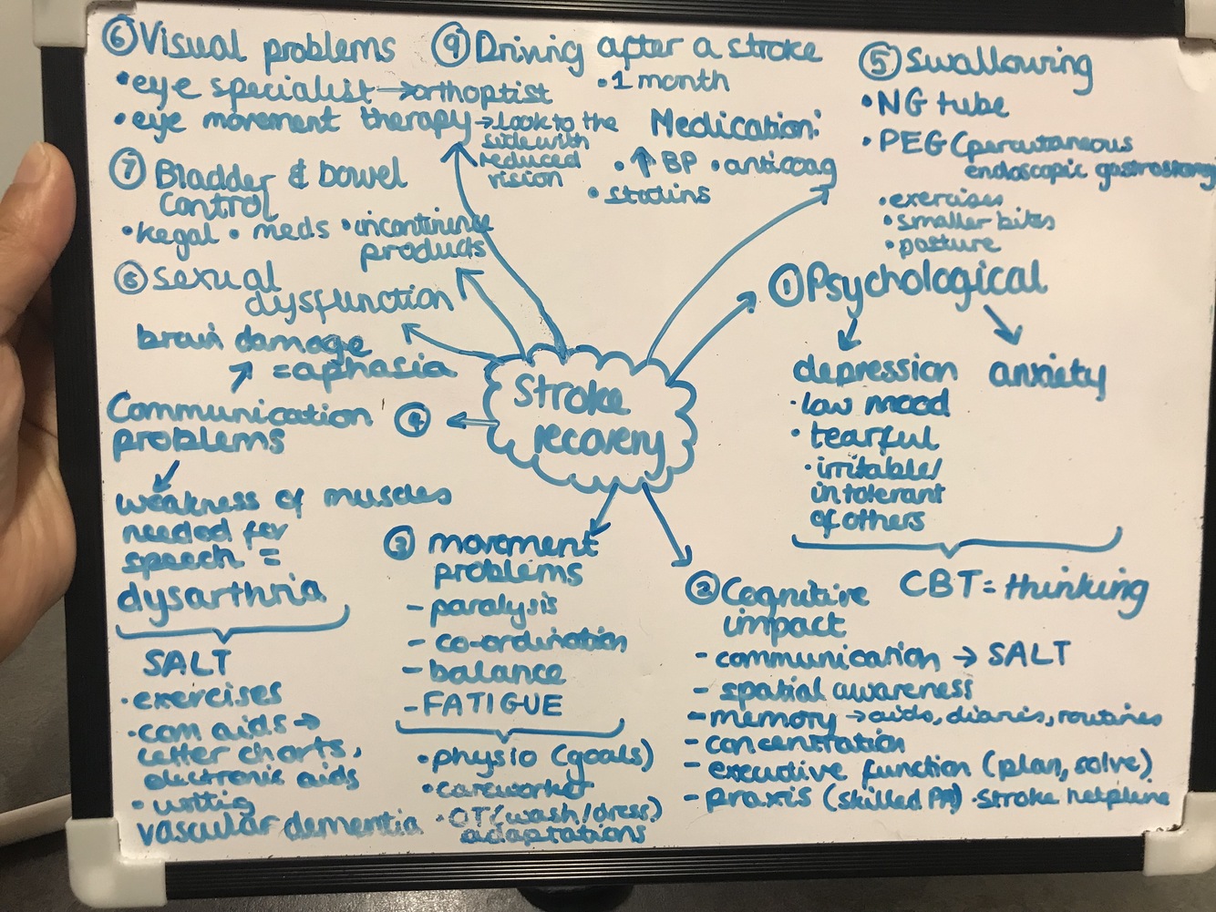 o FAST: Face (facial drooping) Arm (arm weakness), Speech( speech slurred) and Time ( time to call 999). This was developed to raise public awareness to recognise signs of a stroke and call for help early.