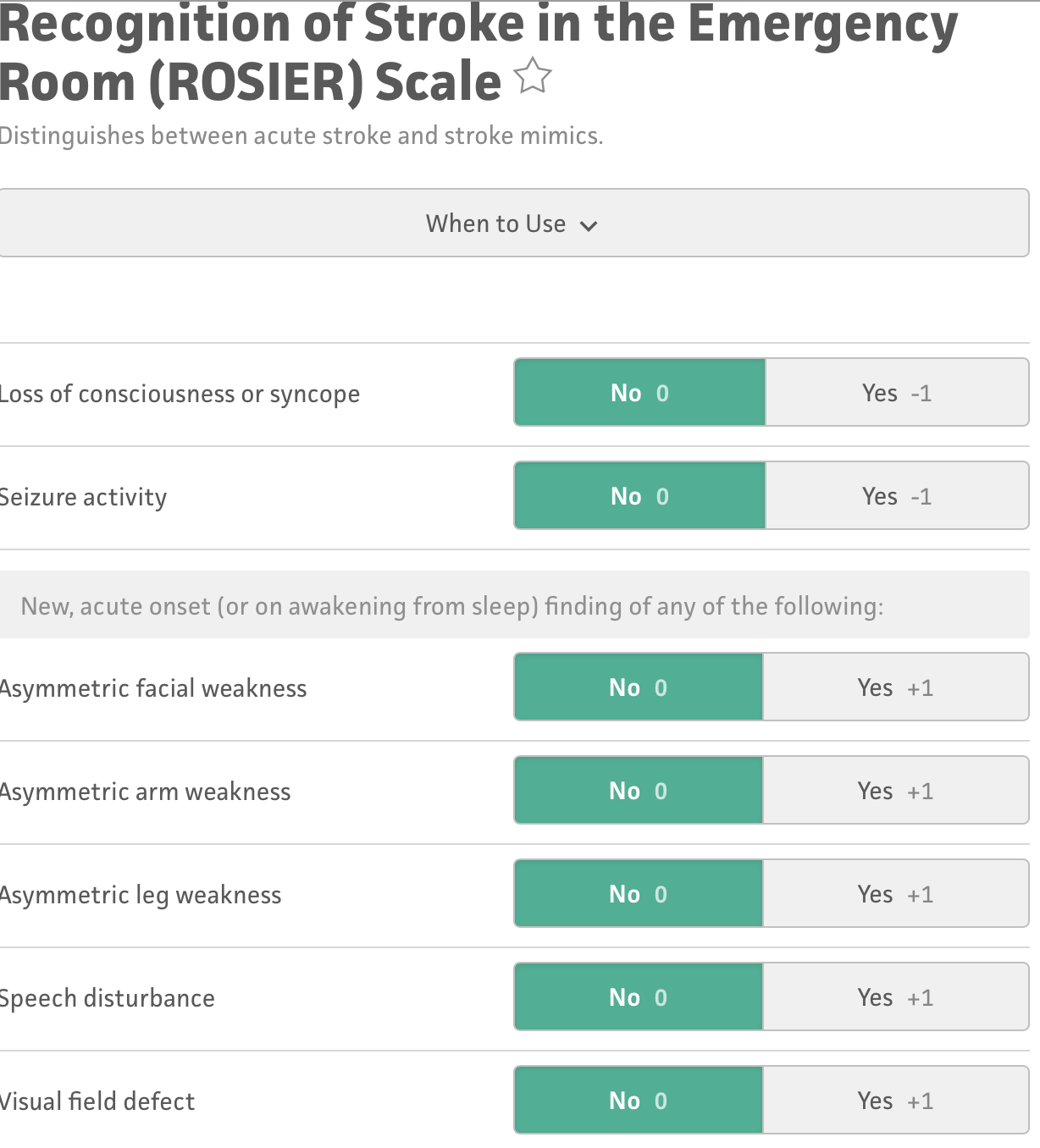 o ROSIER: the rosier scale has been developed to help medical staff distinguish between a stroke and a stroke mimic. This is commonly used in the accident and emergency department. A copy of this can be found in your appendix.