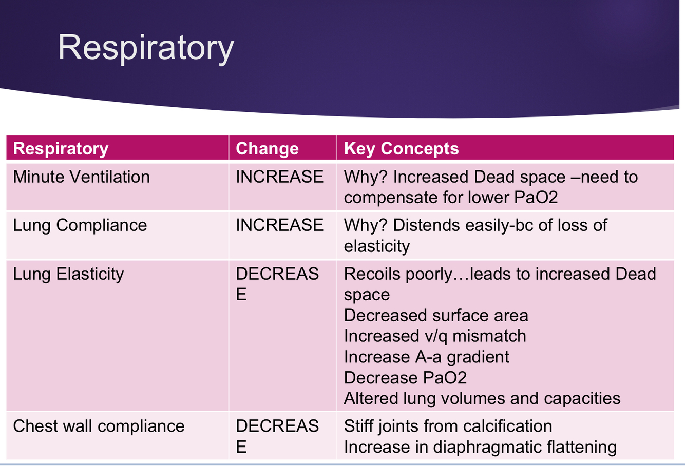 OVerall resp changes: Min ventilation, lung compliance, lung elasicity, chest wall compliance
