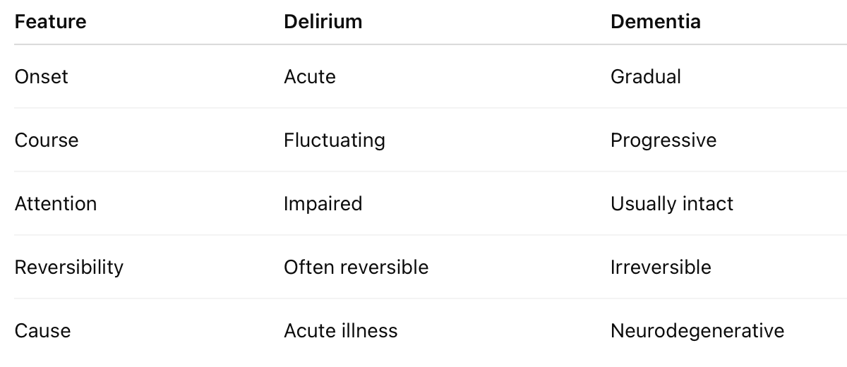 Delirium is acute and fluctuating; dementia is chronic and progressive.