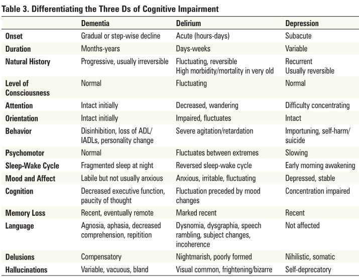Differentiate dementia, delirium and depression from eachother.