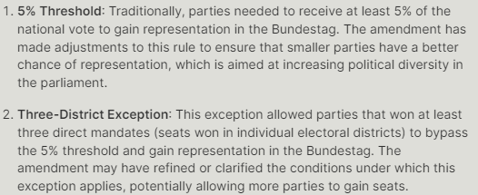 electoral threshold: 5% of national vote (Zweitstimme) or 3 or more direct mandates (until 2021)