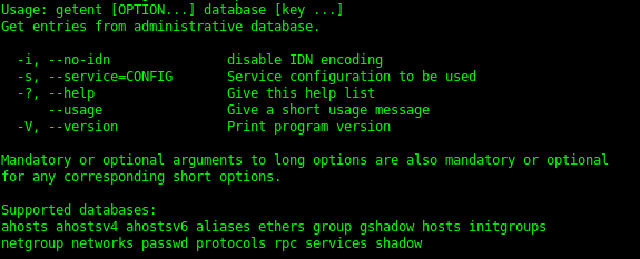 The getent command displays entries from databases supported by the Name Service Switch libraries, which are configured in /etc/nsswitch.conf.