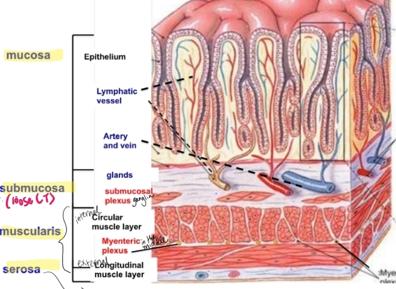 loose connective tissue, arteries, veins, lymphatics, submucosal plexus [ganglia] (at the base)