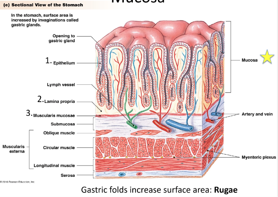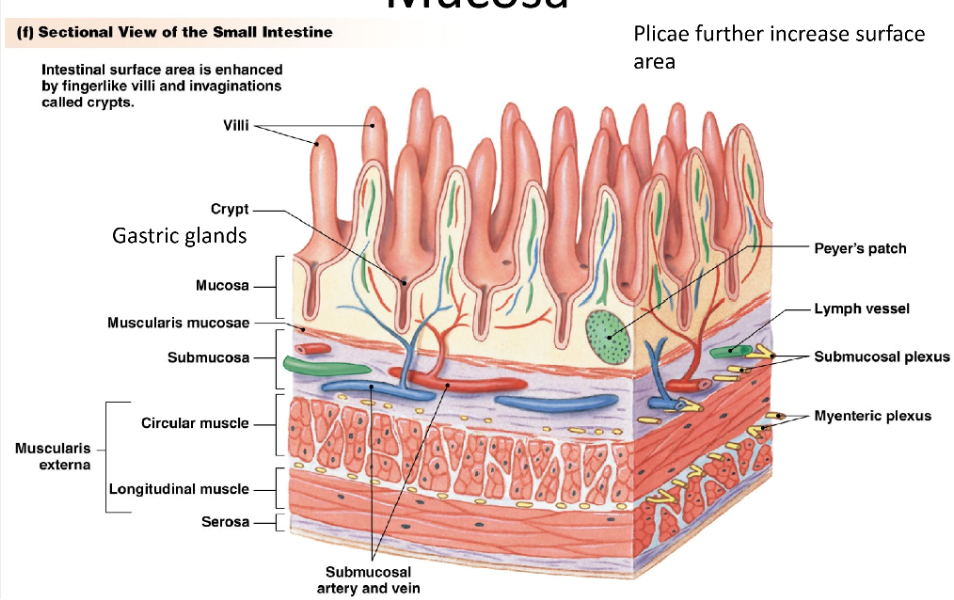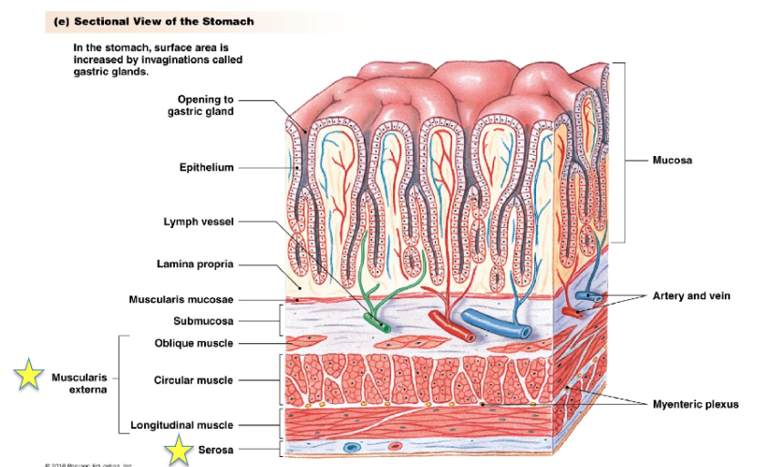-muscularis externa: 2 or 3 layers of smooth muscles: circular diameter, longitudinal shortens the tube. contains myenteric plexus