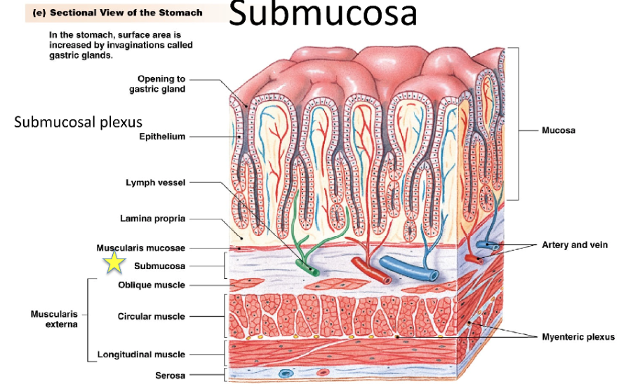 -middle distensible layer containing larger vessels (lymph and blood) and the submucosal plexus: one of the major nerve networks in the enteric nervous system