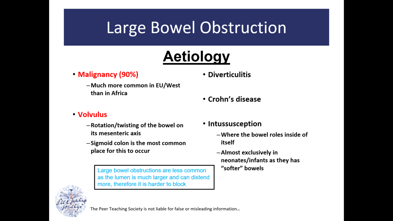 What is the aetiology of large bowel obstruction?