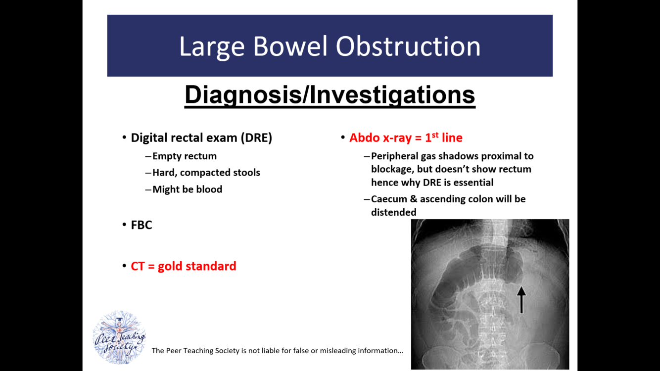 What are the investigations for large bowel obstruction? What is diagnostic?