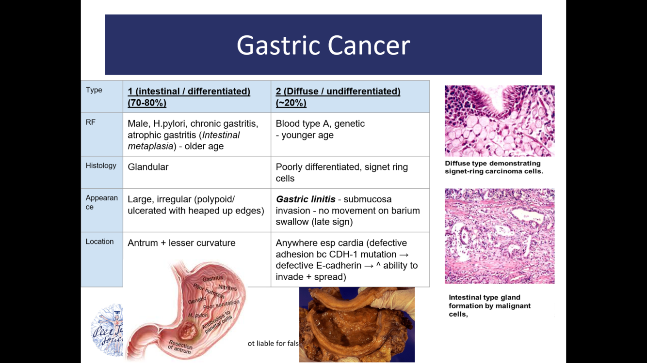 What is gastric/stomach cancer? What are the two histological types?
