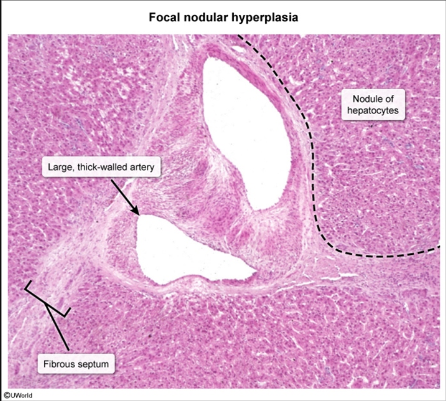 Focal nodular hyperplasia is a benign liver lesion marked by a central stellate scar with radiating fibrous septa that microscopically contain abnormally large, thick-walled arteries. It usually arises in asymptomatic young women, and most cases are found incidentally.