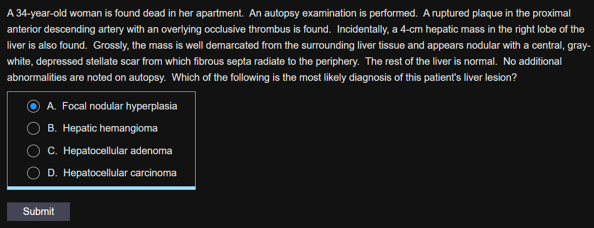 (Choice C) Hepatocellular adenoma is a benign liver lesion that is strongly associated with oral contraceptive use that may undergo malignant transformation or rupture. Although it can also be discovered incidentally, a hepatocellular adenoma usually appears as a well-circumscribed, solitary mass without a central scar. Histopathology typically shows hepatocytes without atypia and an absence of normal hepatic architecture (no portal structures or bile ducts).
