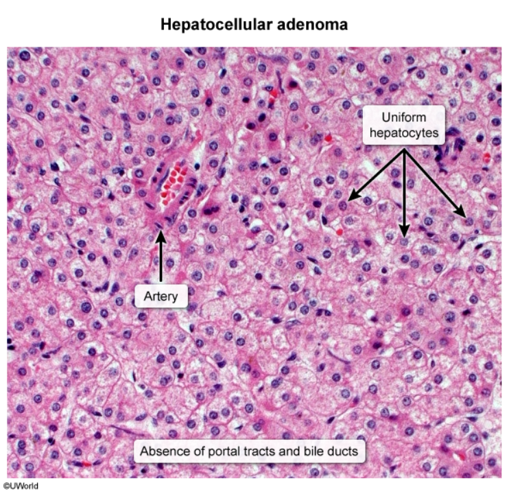 Hepatocellular adenoma is a benign liver lesion that is strongly associated with oral contraceptive use that may undergo malignant transformation or rupture. Although it can also be discovered incidentally, a hepatocellular adenoma usually appears as a well-circumscribed, solitary mass without a central scar. Histopathology typically shows hepatocytes without atypia and an absence of normal hepatic architecture (no portal structures or bile ducts).