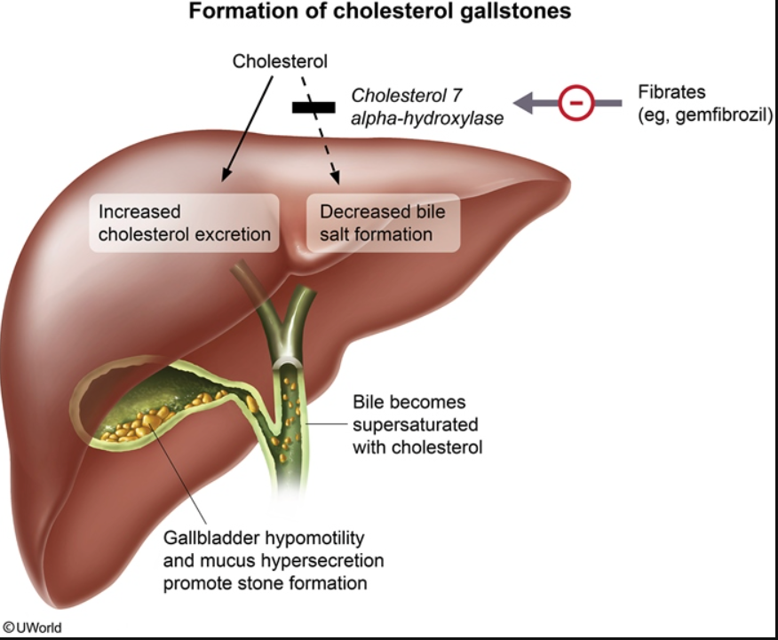 Fibrate medications (eg, fenofibrate, gemfibrozil) upregulate lipoprotein lipase, resulting in increased oxidation of fatty acids. In addition, fibrates inhibit cholesterol 7α-hydroxylase, which catalyzes the rate-limiting step in the synthesis of bile acids. The reduced bile acid production results in decreased cholesterol solubility in bile and favors the formation of cholesterol stones.