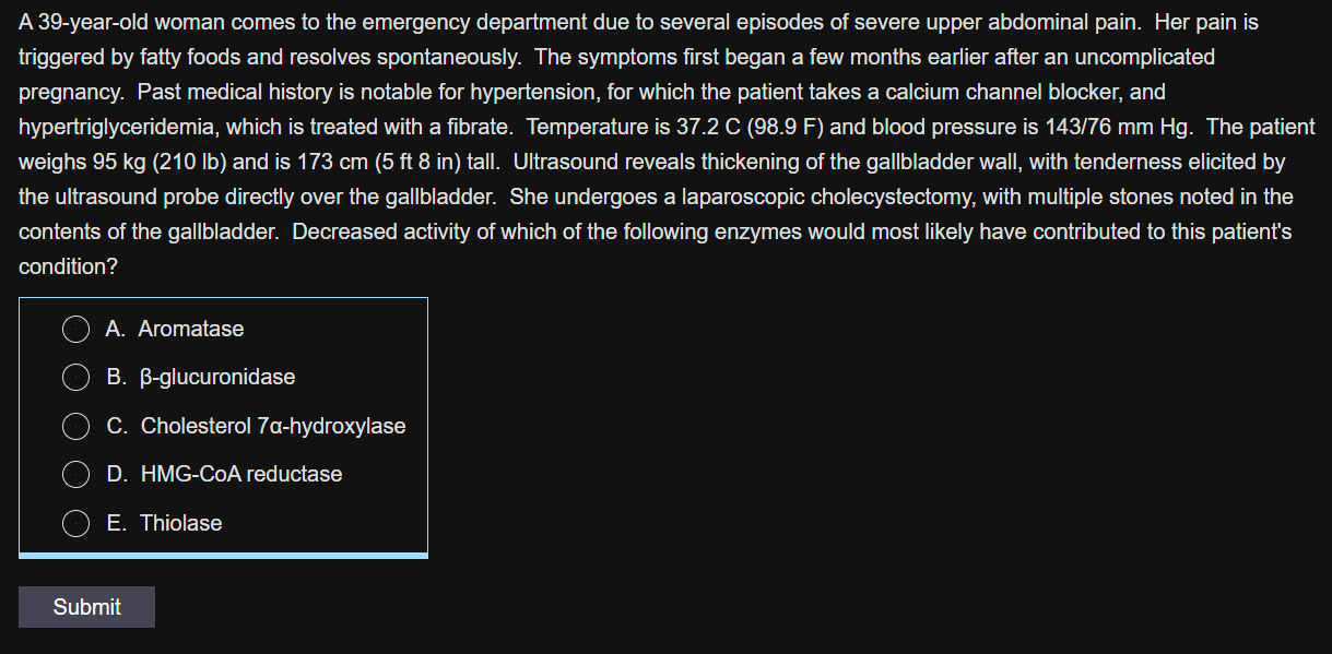 (Choice B) β-glucuronidase is released by damaged hepatocytes and bacteria in infected bile. It deconjugates bilirubin, and the resulting free bilirubin precipitates with calcium in the bile to form pigmented gallstones. Decreased activity of this enzyme would reduce the formation of pigmented stones but would not affect the formation of cholesterol gallstones.