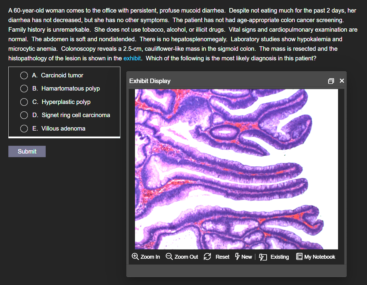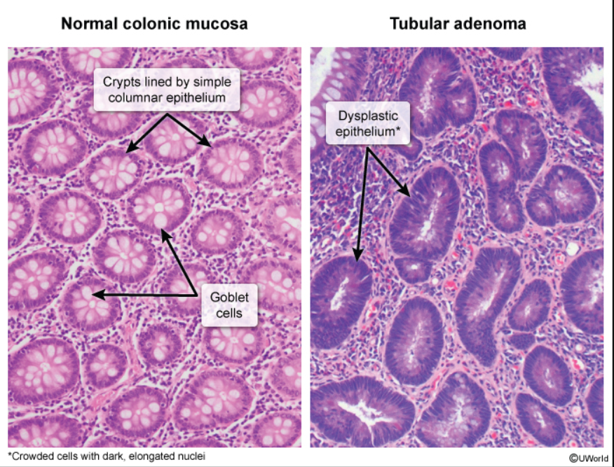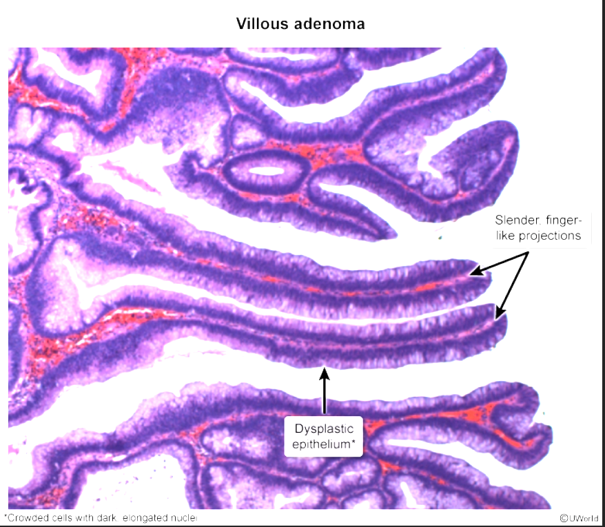 Biopsy of this patient’s mass demonstrates long glands with finger-like (villous) projections extending from the surface as well as dysplastic epithelium, which are characteristic of a villous adenoma. A villous adenoma is often large and sessile and can have velvety or cauliflower-like projections. By contrast, a tubular adenoma is composed of dysplastic colonic mucosal cells that form tube-shaped glands and tends to be smaller and pedunculated. A mixture of these 2 types indicates a tubulovillous adenoma. Of these, villous adenomas are the most likely to undergo malignant transformation.