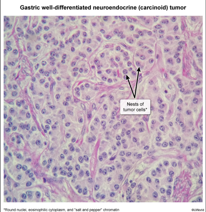 (Choice A) Intestinal carcinoids can cause diarrhea and are often associated with additional symptoms such as flushing, wheezing, and vascular telangiectasia when they metastasize. Histopathology is typified by insular (nesting) masses of small, round cells with peripheral palisading, granular cytoplasm, small nucleoli, and salt-and-pepper chromatin.