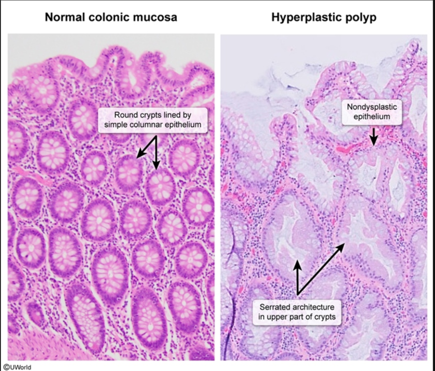 (Choice C) Hyperplastic polyps are characterized by a proliferation of nondysplastic epithelial cells resulting in a serrated or “sawtoothed” architecture seen in the upper parts of the crypts. They are typically small lesions and almost always asymptomatic.